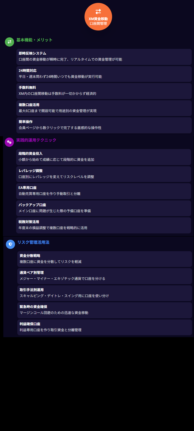 XMでは、複数のリアル口座を開設していれば、会員ページから口座間の資金を自由に振り替えることができる。トレード用口座で利益が出た後に、その利益分のみを資金保管用口座へ移動することで、「運用資金」と「確定利益」を分けて管理でき、強制ロスカットなどのリスクから利益を守りやすくなります。
