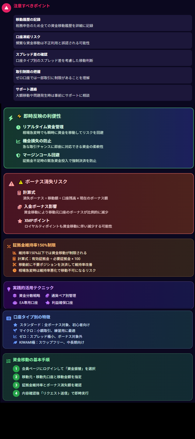 また、口座タイプや基本通貨によっては、ボーナスの一部が消滅したり、ボーナス残高が同時に移動するなどの条件があり、特にゼロ口座や特定口座への移動時はボーナスルールの確認が欠かせません。最低移動額(例:500円以上など)が設定されている点も含めて、事前に公式サイトや運営の最新ルールをチェックしておくと安心です。
