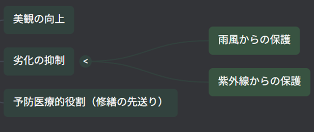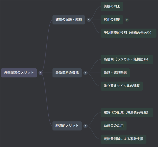 外壁塗装そのもののメリットとしては、見た目がきれいになるだけでなく、建物を雨風や紫外線から守り、劣化を遅らせることで、大掛かりな修繕を先送りにできる「予防医療」のような役割があります。